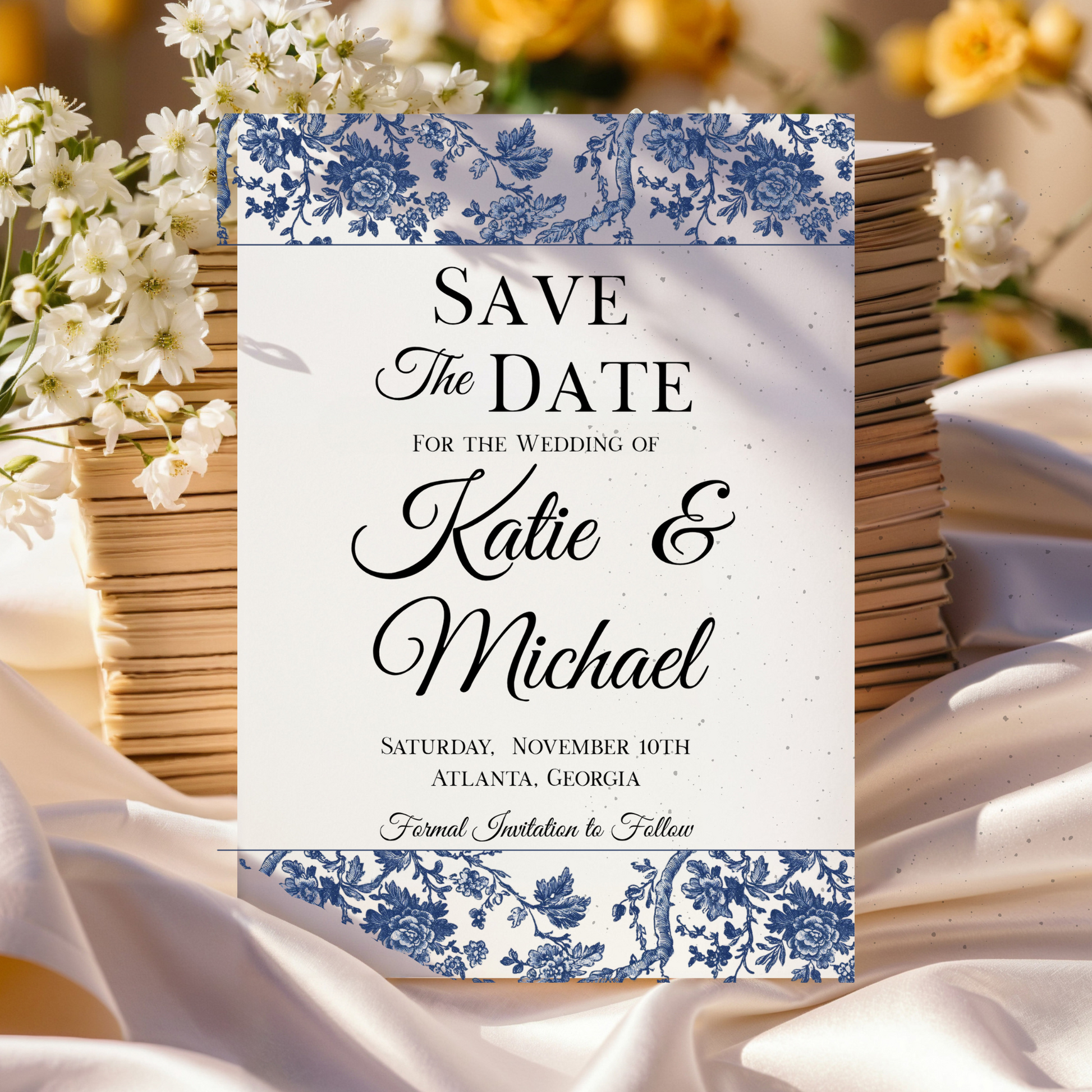 Blue Toile Seed Paper Save the Date – Elegant Plantable Wedding Cards (6x4")
